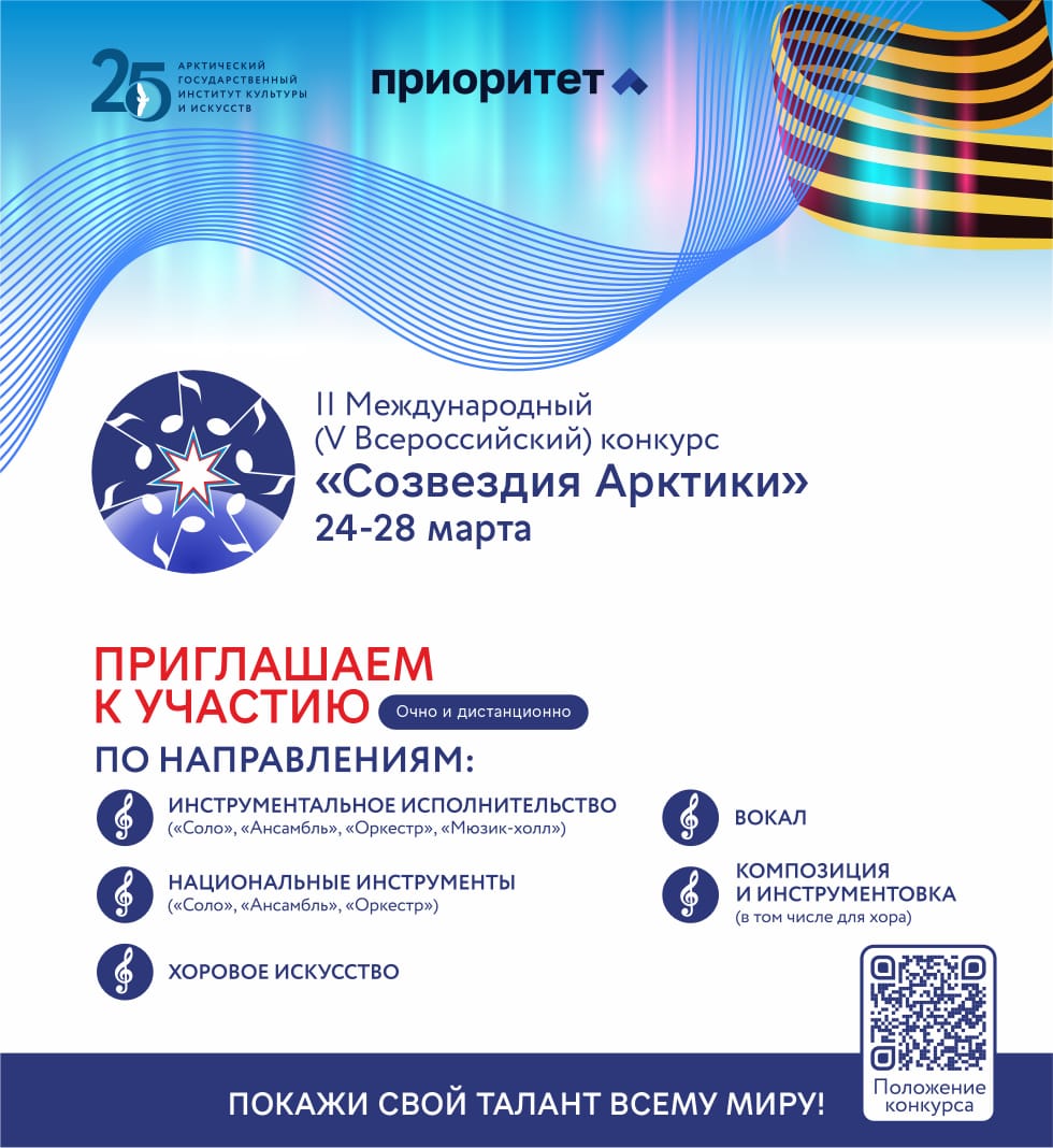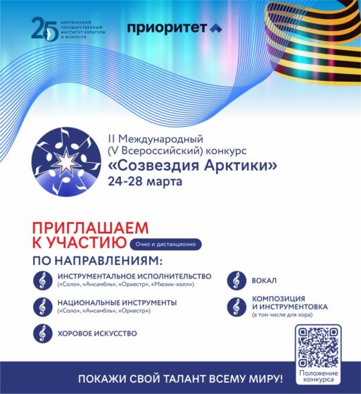 «Созвездия Арктики – 2025» зажгут новые таланты и представят звездные концерты. Арктический государственный институт культуры и искусств (АГИКИ) приглашает к участию во II Международном конкурсе «Созвездия Арктики – 2025», посвященном 80-летию Победы в Великой Отечественной войне и 25-летию института. Конкурс пройдет с 24 по 28 марта 2025 года в очном и дистанционном форматах в рамках программы стратегического академического лидерства «Приоритет-2030. Дальний Восток».