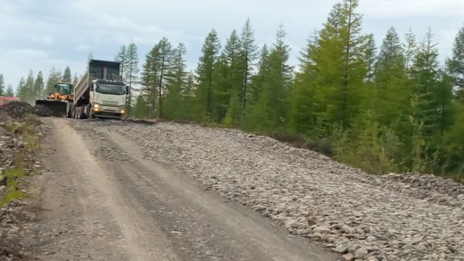 Затем укладка земполотна, дорожной одежды из ПГС мелкой фракции, ремонт труб, устройство канав и откосов. Работы на пятикилометровом участке этого года начались в мае и завершаются в сентябре.