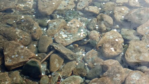 Короткая остановка у Шаман-ручья. Ручей особый, что и по названию понятно, он не замерзает зимой. Проезжающие бросают монетки. Спускаемся по деревянным ступеням к воде и видим усыпанное монетами дно.