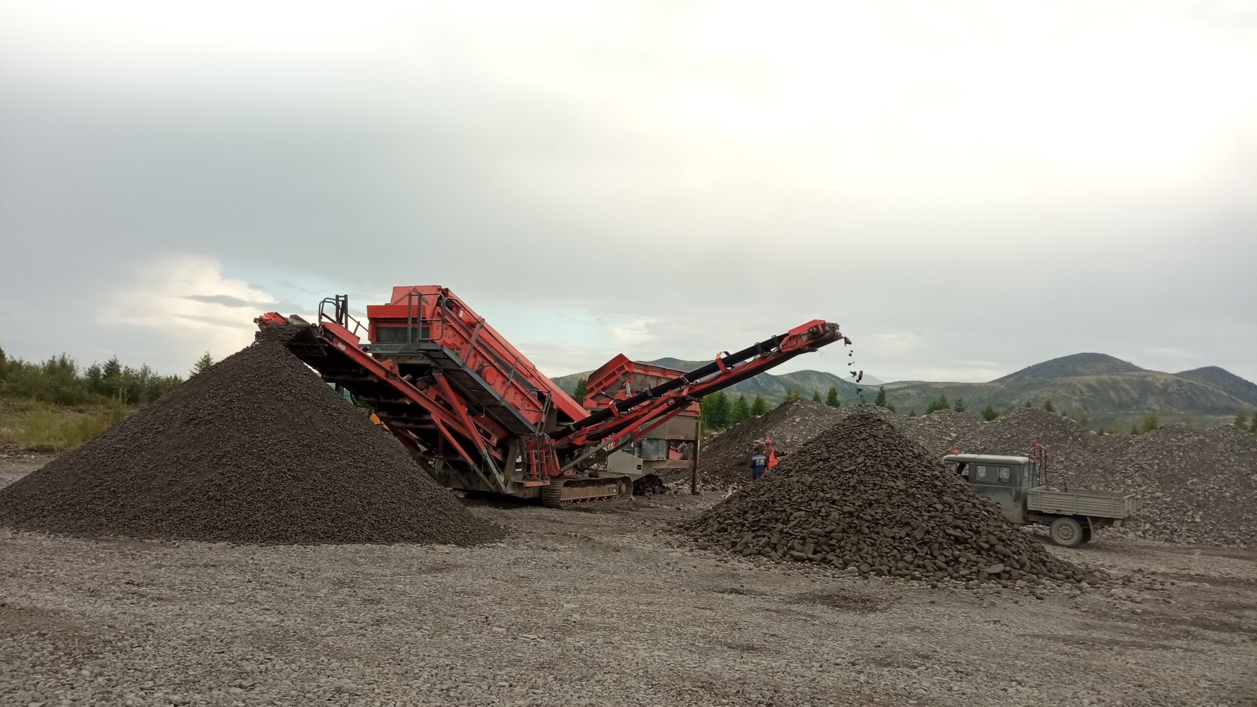 Несколько минут езды от участка ремонта, ипо ушам бьет мощный грохот, потому что перед нами – грохот, то есть дробильно-сортировочный комплекс. Похож на небольшого монстра с двумя длинными руками. Вообще-то, вид не страшный, а вот шум вполне.