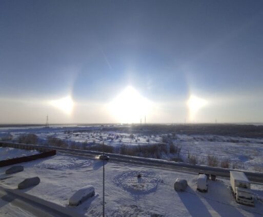 Явление «тройного солнца» – это редкий оптический феномен, называемый паргелий (или «ложное солнце»), часть более широкого явления гало, возникающая из-за преломления солнечного света в кристаллах льда в атмосфере. Это создает иллюзию двух ярких радужных пятен по бокам от настоящего солнца, которые выглядят как его «двойники». Для его возникновения нужны мороз, яркое солнце, определенная плотность облаков (перисто-слоистых) и шестигранные кристаллы льда, падающие определенным образом.